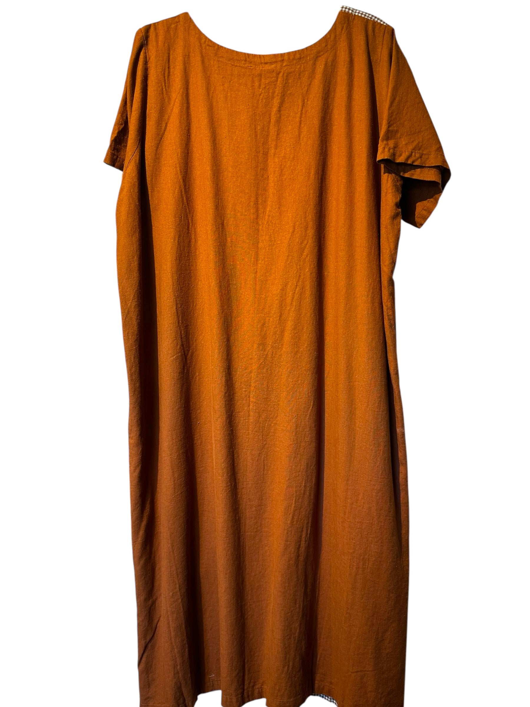This vintage Hawaiian maxi dress features a bold screen print of a large hibiscus flower, paired with a mix of gingham and solid fabrics for a distinctive island look. Designed with a comfortable silhouette and a single large front pocket for a touch of practicality. Label: Melons. Made in Hawaii.