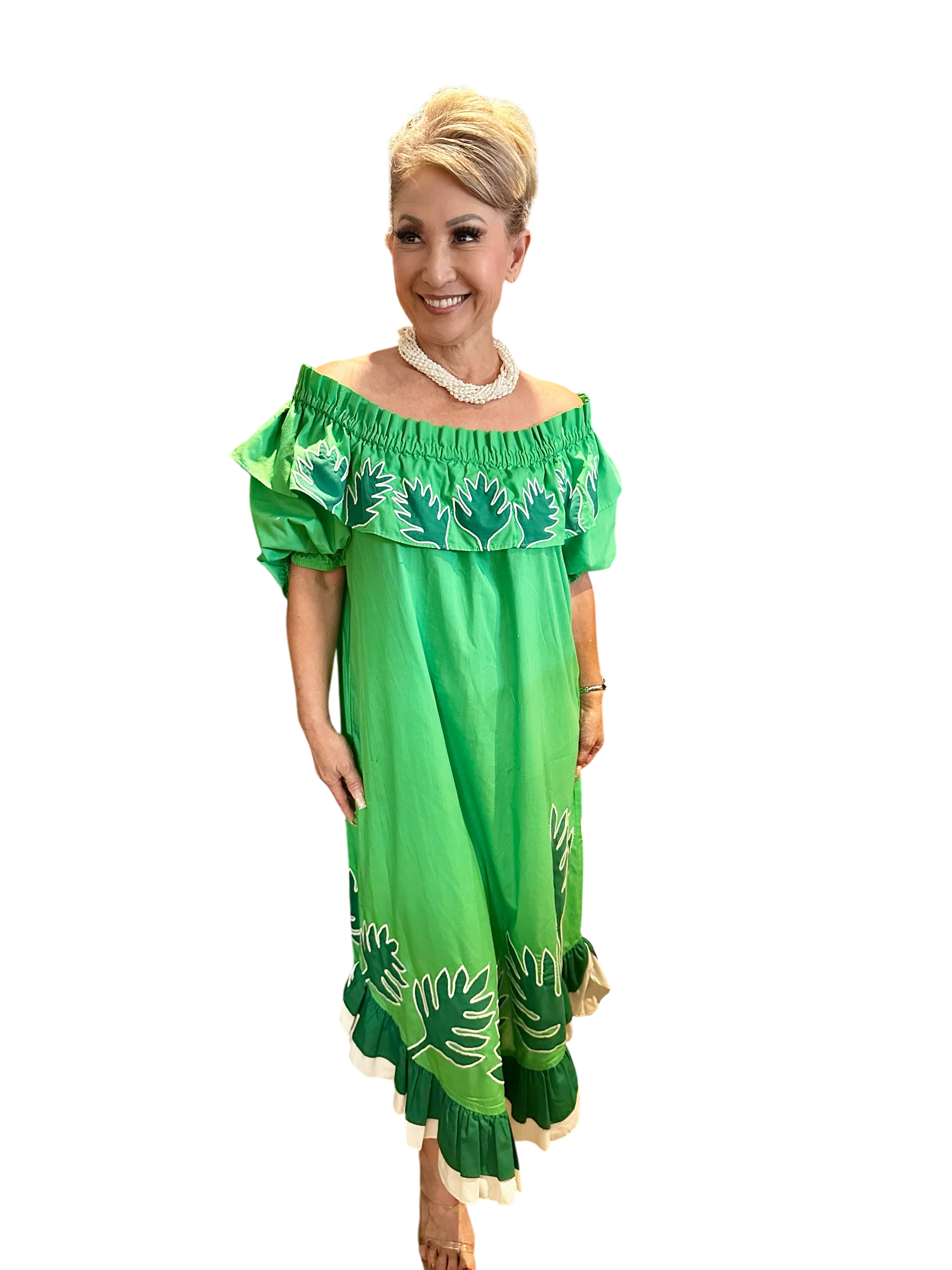 Highly coveted Puamana Crabbe appliqué muumuu featuring a stunning green-on-green laua'e leaf design. This timeless piece has elastic at the neckline and sleeves, allowing it to be worn on or off the shoulders for a versatile and elegant look. A true vintage treasure that embodies classic Hawaiian style.